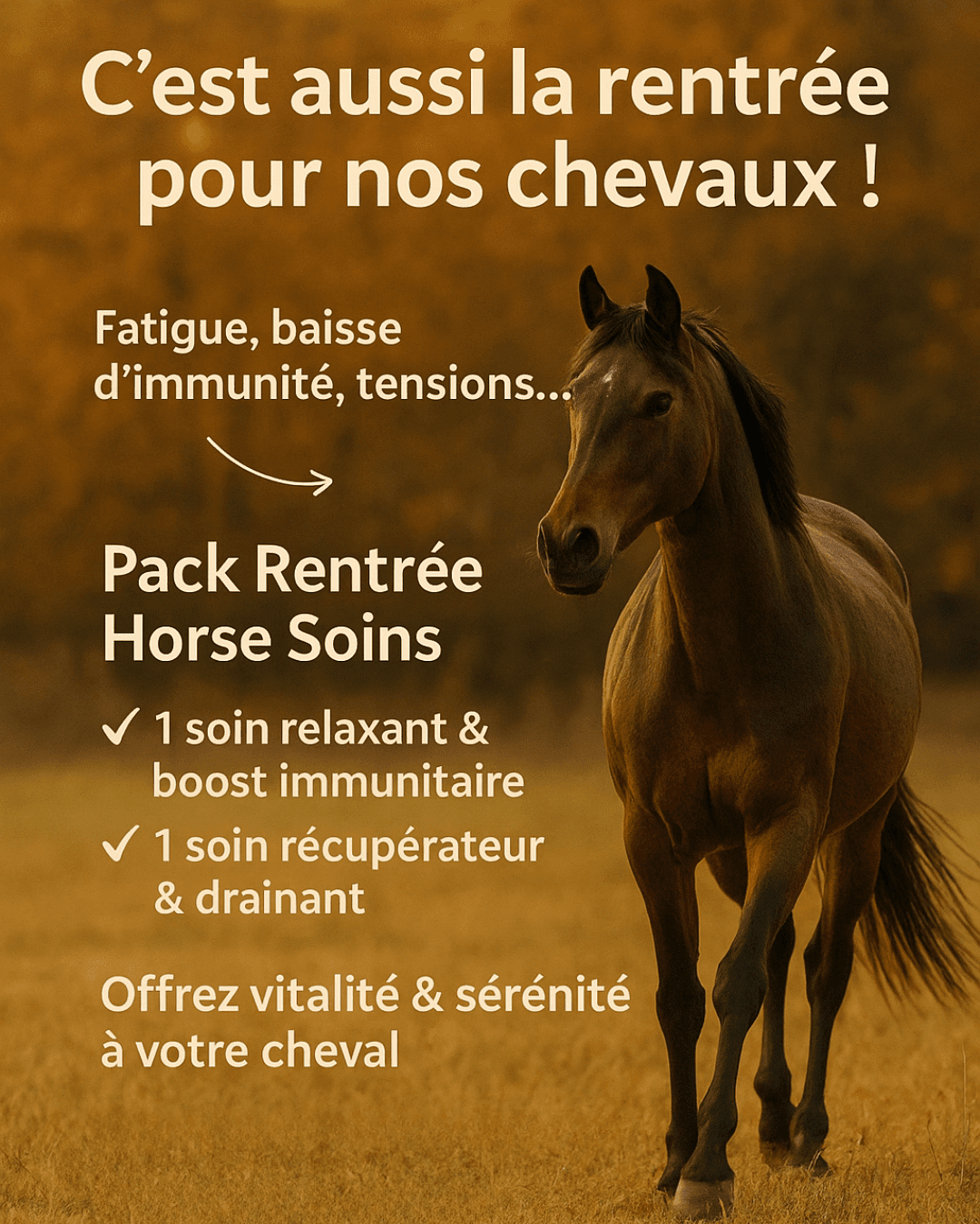 Offrez à votre cheval une rentrée en pleine forme! Le Pack rentrée associe un soin relaxant & boost immunitaire + un soin récupérateur & drainant. Idéal après l'été pour renforcer défenses, vitalité et confort articulaire.